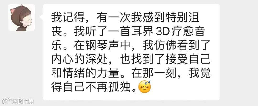 我记得,有一次我感到特别沮丧。我听了一首耳界3D疗愈音乐。在钢琴声中,我仿佛看到了内心的深处,也找到了接受自己和情绪的力量。在那一刻,我觉得自己不再孤独。