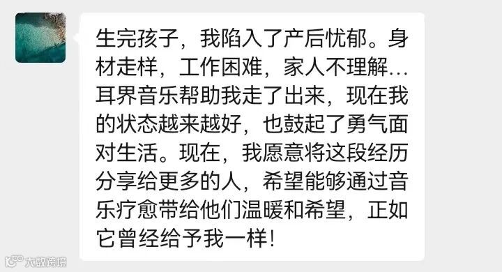 生完孩子,我陷入了产后忧郁。身材走样,工作困难,家人不理解…耳界音乐帮助我走了出来,现在我的状态越来越好,也鼓起了勇气面对生活。现在,我愿意将这段经历分享给更多的人,希望能够通过音乐疗愈带给他们温暖和希望,正如它曾经给予我一样!