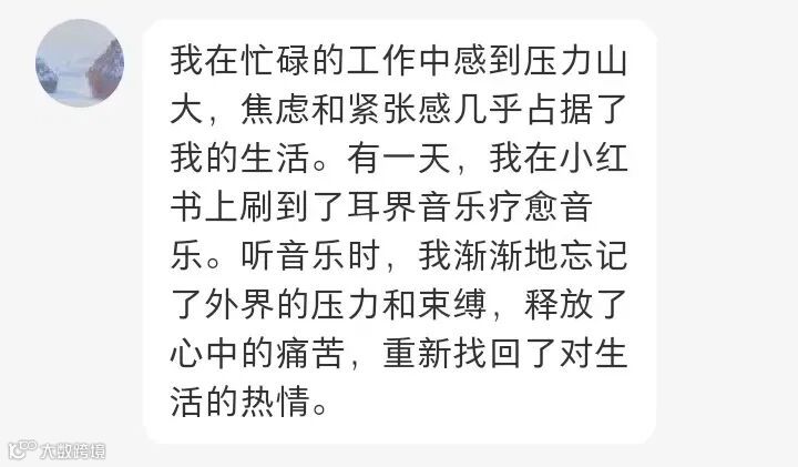 我在忙碌的工作中感到压力山大,焦虑和紧张感几乎占据了我的生活。有一天,我在小红书上刷到了耳界音乐疗愈音乐。听音乐时,我渐渐地忘记了外界的压力和束缚,释放了心中的痛苦,重新找回了对生活的热情。