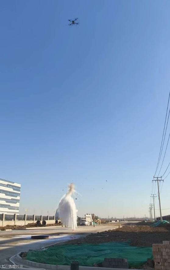 随后,演练现场设置了4个点火油盆,雷纳飞手操控消防无人机精准悬停,向着火油盆喷洒高效喷洒灭火剂,瞬间压制火势,展现出无人机灭火在开阔场景下的高效响应与精准覆盖特性。