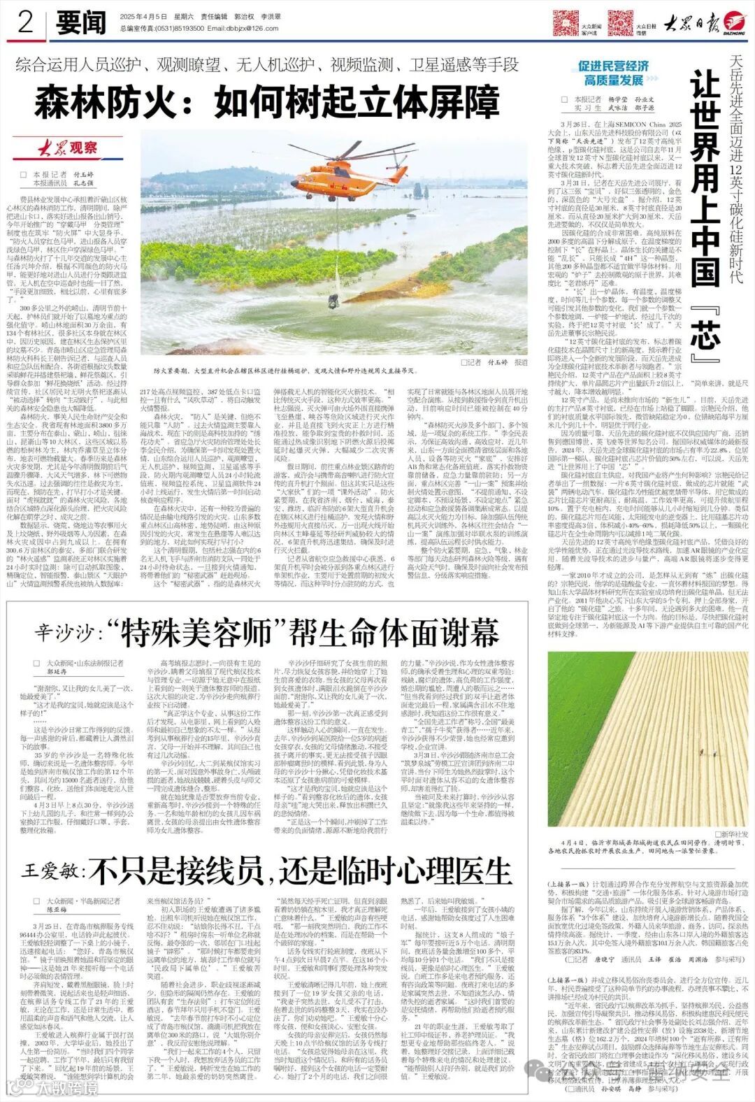 春季是森林火灾高发季节,在绿色发展的大背景下,森林防灭火工作愈发重要。4月5日,大众日报以《森林防火:如何树起立体屏障》为题,发表了省内多地林区积极采取有效措施,运用科技手段,搭建智能系统,提升人员专业素养,严格落实防火责任,守护森林资源,捍卫绿色成果的新闻报道。