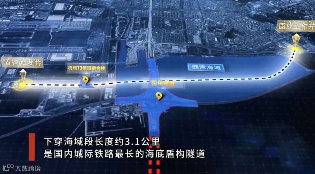 穗莞深城际机前段工程起于已开通的穗莞深城际深圳机场站,终至前海站综合交通枢纽。下穿西湾海域段长度约3.1公里,采用开挖直径9.14米的泥水平衡盾构机施工,是全线独头掘进距离最长、唯一下穿海域的隧道,也是全线环境风险最高的工程。