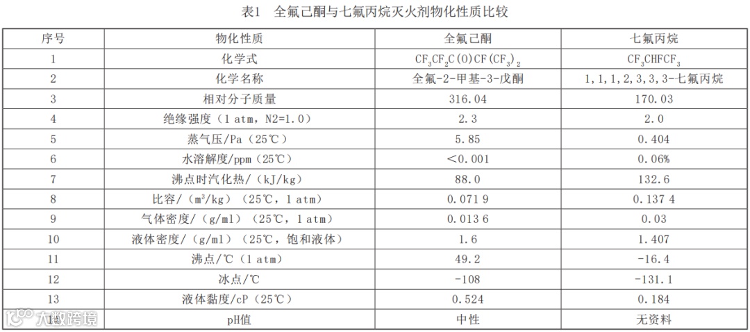 为了全面认识和了解全氟己酮灭火剂的相关性质和灭火性能,现将其与常用的七氟丙烷灭火剂进行比较:
