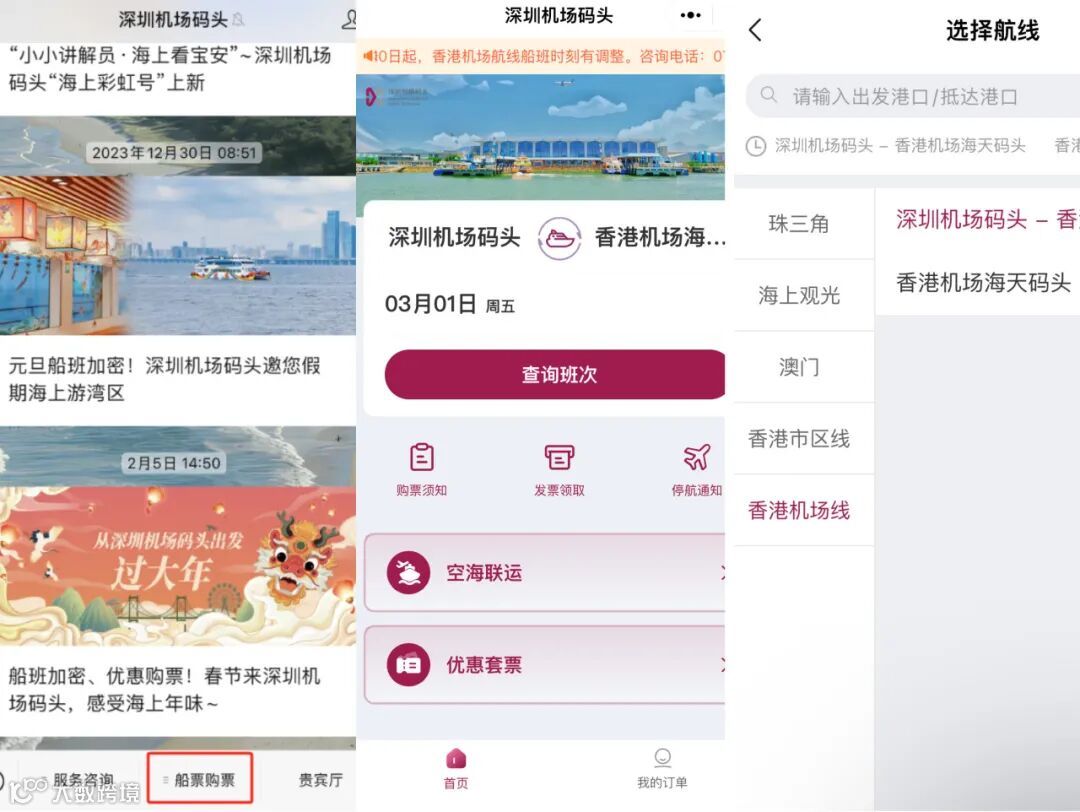 旅客可通过“深圳机场码头”微信公众号预定客船及观光船船票。