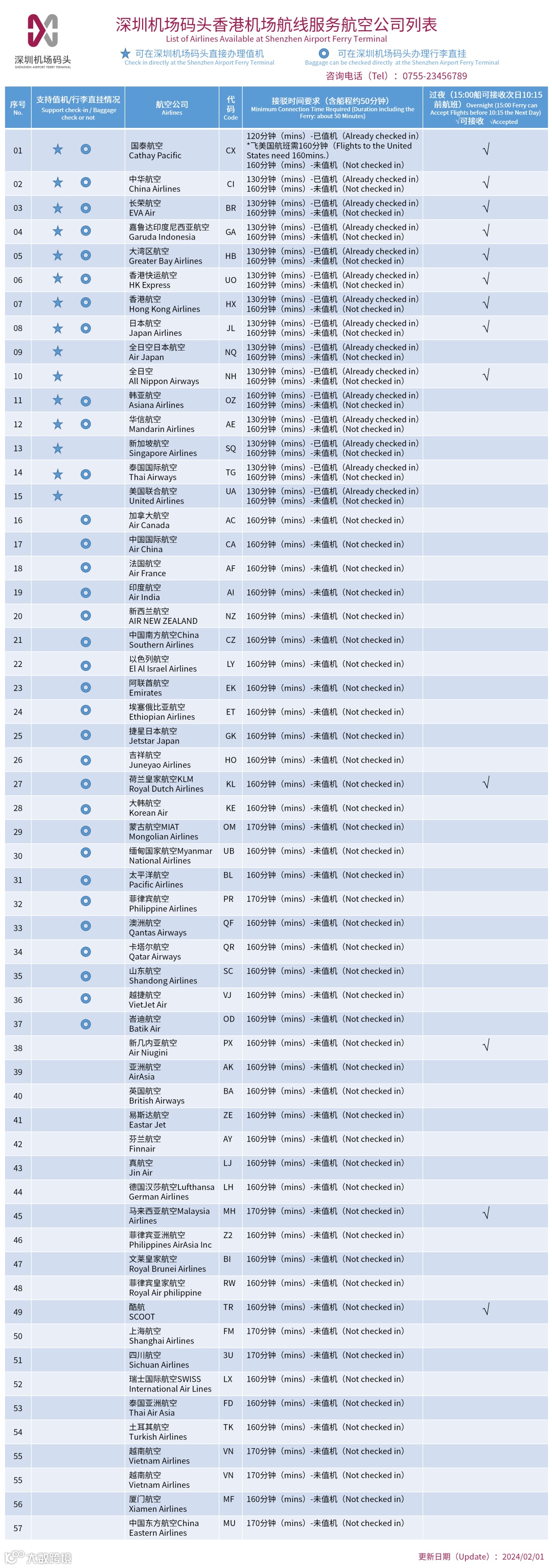 可办理值机的航空公司:在深圳机场码头办理登机牌、退税券,行李直接托运至目的地。