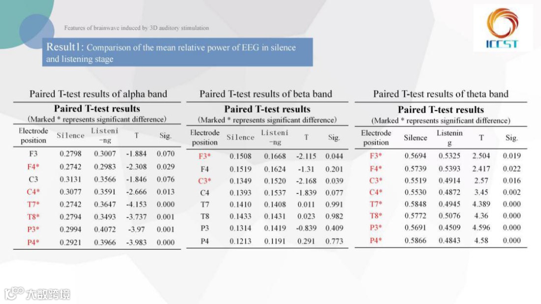 被使者在聆听3D音频后,EEG信号主要记录到的为α波,证明研究对象正处于一种放松状态,这与普通双声道立体声音乐诱发的脑电特征相似,说明3D音乐与普通音乐都能达到放松、减轻压力的效果,且在聆听音乐过程中,α波在右额区的相对功率较静息阶段明显上升,这说明音乐对右额区情绪波动有舒缓作用,有利于调节负面情绪。