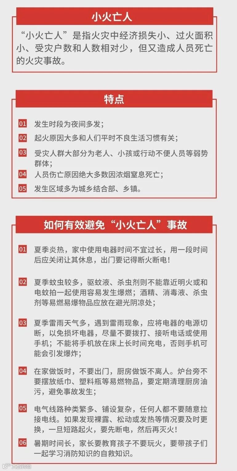 导读:一段时间以来,全国多地发生“小火亡人”事故,究其原因,都是消防安全意识淡薄,缺乏必要的逃生自救常识等原因造成的。“小火亡人”是指火灾中经济损失小、过火面积小、受灾户数和人数相对少,但又造成人员伤亡的