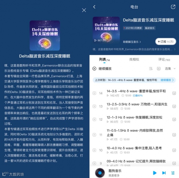 其中,睡眠专区中的“脑波音乐”是与全网领先原创3D音乐疗愈品牌“耳界_Earmersion”联合出品,此套音乐专辑《Delta脑波音乐减压深度睡眠》由上海交通大学医学院医学心理学教授、上海音乐学院音乐治疗团队导师及作曲家共同参与研发。旨在通过科学完善的脑波音乐制作手段,以双耳拍频技术进行声学诱导来产生Delta脑波,从而有效使大脑进入放松而专注的状态,以此帮助失眠、入睡困难、早醒、易醒等睡眠障碍人群,改善睡眠习惯、调整睡眠生理,直达心灵深处的安宁与平静。