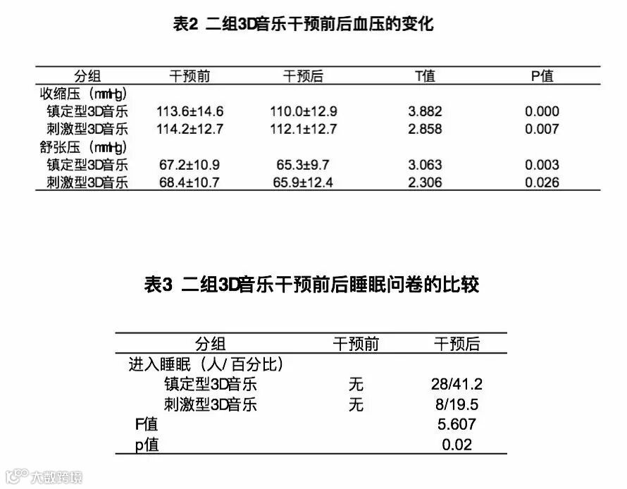 结果两组被试在接受3D音乐干预前后血压的收缩压和舒张压均降低,具有显著性差异(P<O.05),两组均呈现具有促进睡眠的作用。接受“镇定型3D音乐”干预组被试的促进睡眠效果优于接受“刺激型3D音乐”干预组。具有显著性差异(P<0.05)。