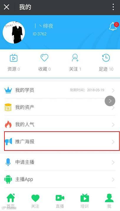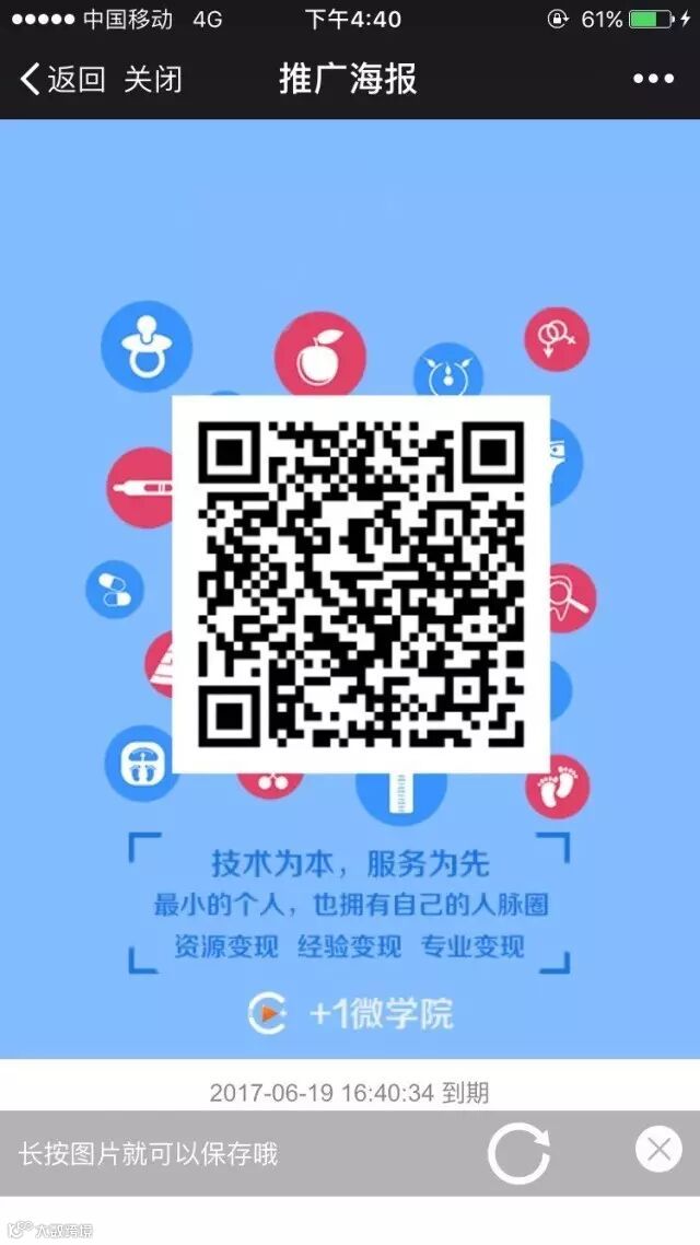 返回个人中心点击进入【推广海报】,长按保存图片并开始通过朋友圈或好友传播,建立自己的人脉圈,从而实现资源变现。(注:如图 所示,推广海报是有时间限制的,时间一旦过期了,二维码就无效了,所以记得要准时按刷新键刷新和定期推广哦)