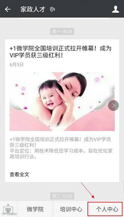请各位关注小编的微信公众号【家政人才】,点击进入【个人中心】