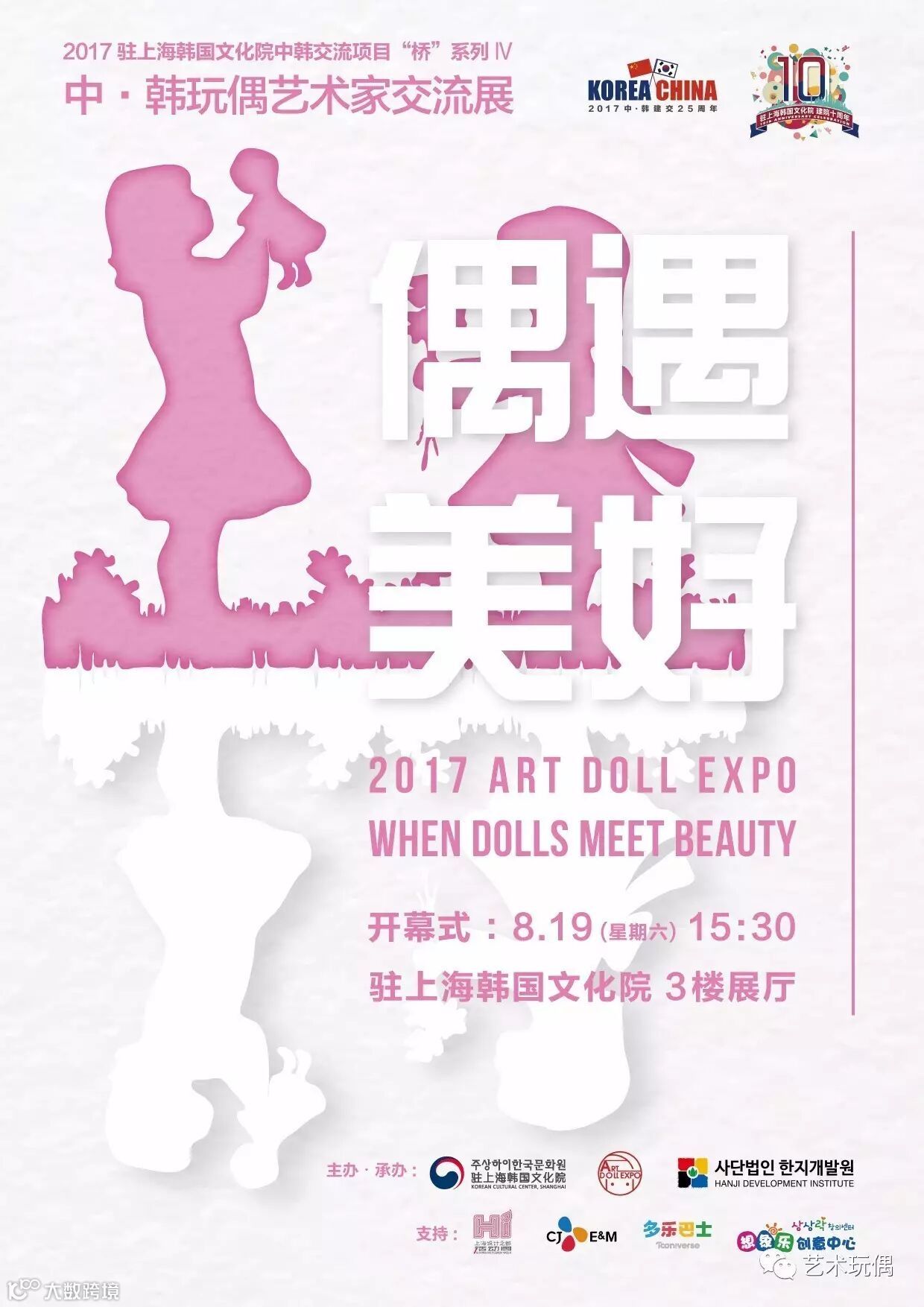 作为2017驻上海韩国文化院中韩文化交流项目“桥”系列展览活动之一,由国际艺术玩偶展(中国)ART DOLL EXPO联合韩国韩纸开发院将于2017年8月19日(星期六)至9月16日(星期六)举办2017【偶遇美好】中韩国际艺术玩偶特展。同时,此展览纳入2017上海设计之都活动周外场合作艺术特展项目。
