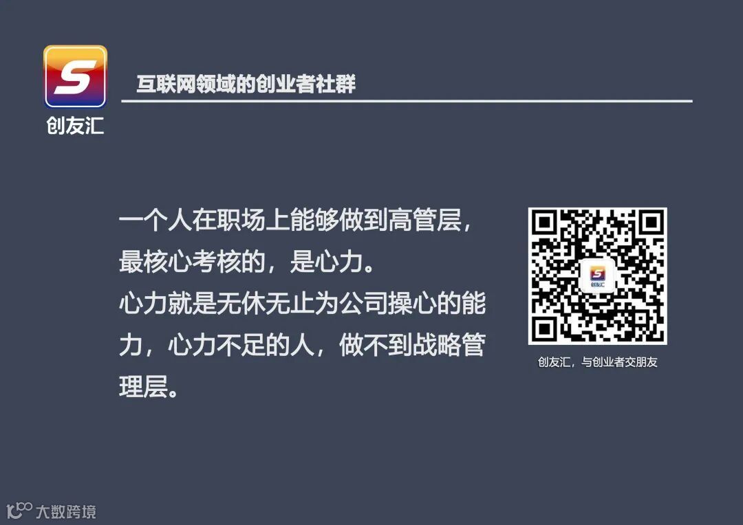 梁宁老师说:能否达到战略管理层,核心考核的,就是心力。心力就是无休无止操心的能力,因为资源有限,战略常变,兄弟都亲,没人满意。心力不足的人,做不了核心管理层。