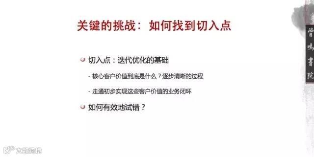 因此,在0-0.1的阶段,最关键的挑战就是如何科学有效地找到切入点。互联网思维最重要的一点是迭代优化,如果你没有切入点,你连迭代的机会都没有,你没有办法在一个和客户交互的界面中,得到给你的反馈(什么好,什么不好,从而去改进),甚至连最基础的一个问题“到底给什么用户提供什么价值”,在早期都无法回答。