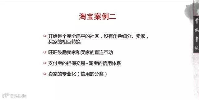 同时又要求所有淘宝员工用小二的身份去服务好创业者,所以早期淘宝的社区文化是非常鲜明的,因为小二跟店主的关系是非常紧密的,这样的社区文化驱动了整个生态的发展,且这样的文化和价值观是建立在当时的大趋势上以及对当时中国社会经济发展的深刻认识上。