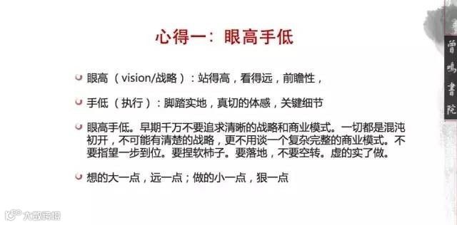 “眼高手低、试错一定要基于Vision(愿景和方向)、悬崖边的狂欢、自我修炼(自信和自疑)”,这四点心得不一定准确或穷尽,是根据阿里经验和创业者沟通中单独提出来的。
