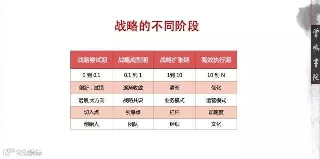 第三个阶段其实就是战略扩张期,大部分我们讲需要聚焦,需要执行力,战略目标怎么分解,分解之后怎么快速拿结果,其实都是这个阶段。