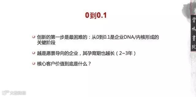 具体来讲,在0-0.1阶段,不要追求干净漂亮清楚,在这个阶段,战略是讲不清楚的,更不用说业务模式和收入模式,这是一个逐步磨的过程,要先从边缘的软柿子开始捏起,捏多了,你自然可以捏更硬的,如果是一开始啃硬骨头的,一般成了先烈,因为你成了别人的样板。