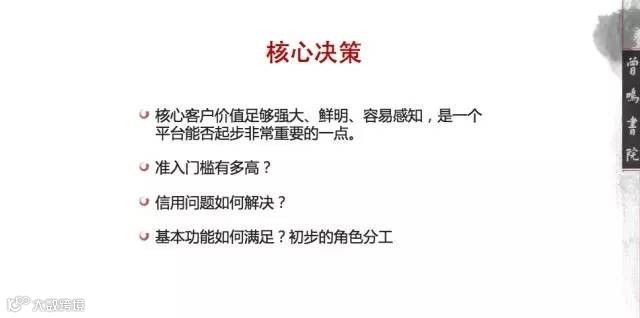 第一,核心客户价值足够强大、鲜明、容易感知,是一个平台能否起步非常重要的一点;
