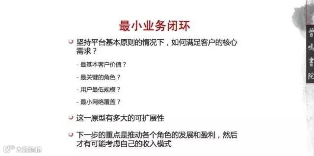 就是你完成了最小业务闭环,但前提是按照平台化原则,你的产品架构是平台化的,你坚持的是网络的对等原则,你没有越位进去做端对端的解决方案,在这种情况下,你完成了客户(不管客户多少)的基本需求价值提供。