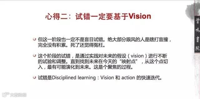很多人试错后,整体还是散的,他试了很多东西,也有很多沉淀和闪光点,但是闪光点拼不到一起,形成不了有突破力的尖刀打开局面。你一定要有一个vision作为试错的前提,否则你试了也白适。只有基于某个基础去测试,你才有迭代的路线和方向。如果没有这个作为前提,就是盲人摸象,最后也摸不出一张整图出来,死了也是冤枉,确实做了很多无用功。