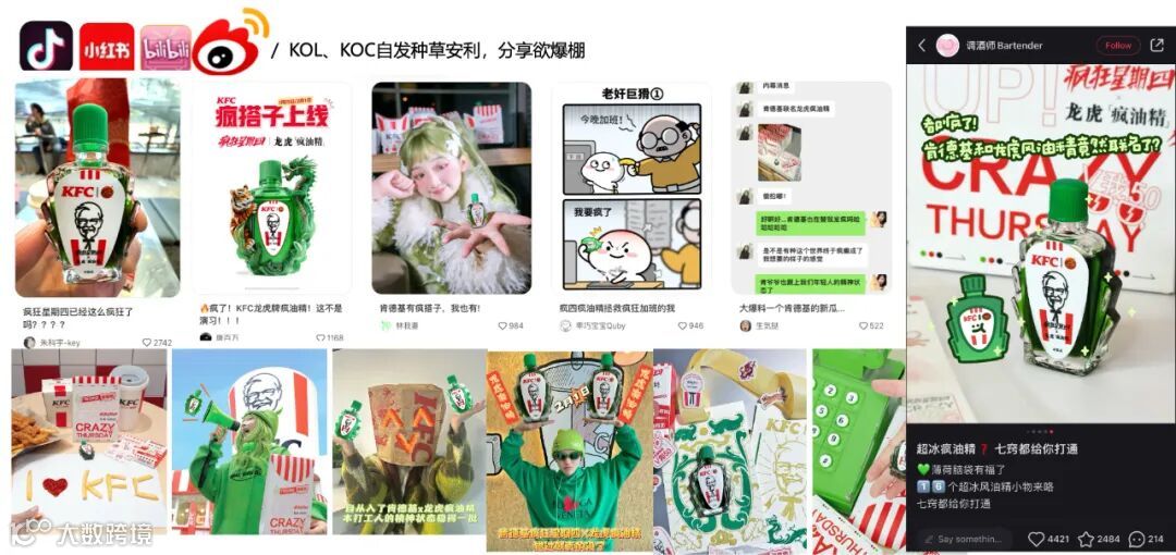 )与“东方神秘力量”著称的龙虎风油精——百年传统药企联名,打造疯油精和醒神贴纸,令全网意想不到,切中年轻人的发疯心态并迅速出圈,更为年轻人提供了二创素材。