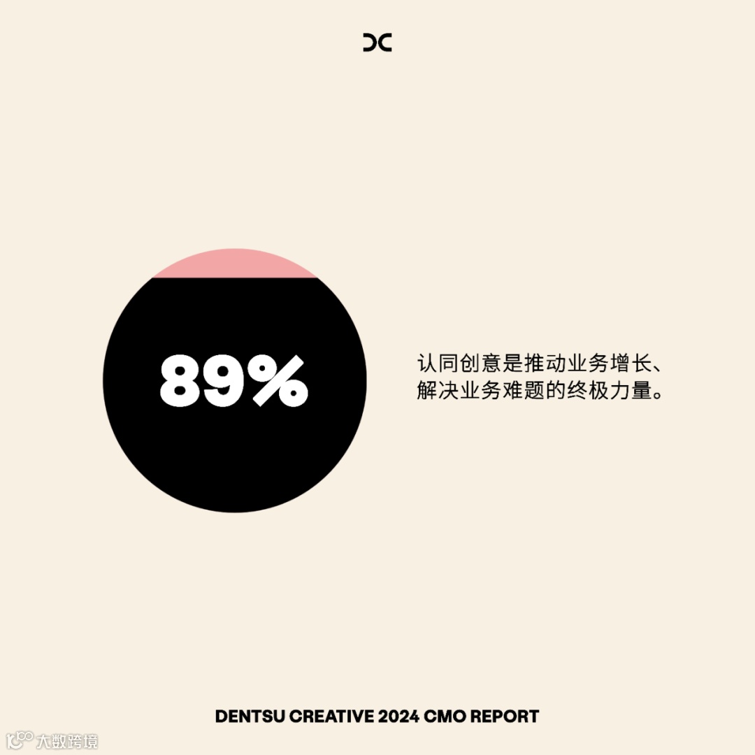 81%的首席营销官认为,创意对营销的重要性达到前所未有的程度。创造力被视为推动业务增长、解决业务难题的终极力量——89%的受访者同意这个观点,其中57%的人表示强烈认同。