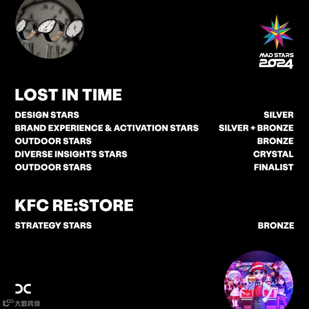 Following a three-day festival, MAD STARS 2024 has revealed its winners last week with Dentsu Group winning Agency of the Year, Network of the Year, and Holding Company of the Year. Agency of the Year: DENTSU INC. Network of the Year: DENTSU GROUP INC.Holding Company of the Year: DENTSU GROUP Dentsu’s creative teams in China, Vietnam, Philippines and Japan collectively secured 29 accolades. My Japan Railway, crafted by the Dentsu Inc. Tokyo team clinched The Grand Prix of the Year in Product & Service and three additional Grand Prix awards. The Dentsu Creative China team is thrilled to have won 6 MAD STARS this year. Lost in Time was awarded a Silver in the Design Stars, a Silver and a Bronze in the Brand Experience and Activation Stars, a Crystal in the Diverse Insights Stars, a Bronze award and was a Finalist in the Outdoor Stars. KFC Re:Store picked up a Bronze in the Strategy Stars. LOST IN TIME SILVER: Design Stars - Non-for-Profit/Charity/GovernmentSILVER: Brand Experience & Activation Stars - Use of Exhibitions & InstallationsBRONZE: Brand Experience & Activation Stars - Non-for-Profit/Charity/GovernmentBRONZE: Outdoor Stars - Non-for-Profit/Charity/GovernmentCRYSTAL: Diverse Insights Stars - Non-for-Profit/Charity/GovernmentFINALIST: Outdoor Stars - Ambient – Transit China has the world’s largest Alzheimer’s population, exceeding 10 million people suffering from the disease. The progression of Alzheimer’s is such that the patient gradually becomes less capable of performing basic daily tasks without assistance. Unfortunately, 70% of those impacted miss out on early detection and treatment. Early detection and intervention could help slow down the disease’s progression by 15%. Presenting Lost in Time, one-of-a-kind artworks created by those suffering from Alzheimer’s. Through the Clock Drawing Test, we turned the time lost by the Alzheimer’s patients into a display, campaign and real timepieces, offering a window into the distorted world of these patients. On World Alzheimer’s Day, a display in the Shanghai metro was launched. It garnered over 17 million people walked through the display in 40 days. On World Health Day, we held an online auction. In 5 days, the watch was bid for at 20 times the regular price of an electronic watch. Though there is no known cure available for this condition, the sooner the disease is recognized and accepted, the better opportunity for slowing its advancement. Bringing diagnostic testing out of the hospital and into everyday life will benefit more people. KFC RE:STORE BRONZE: Strategy Stars - Restaurants Gaming is the new going out, the metaverse the new shopping mall. So how does a brand win at the point purchase when both attention and consumption occasions are shifting? Welcome to KFC Re:Store, a fully shoppable experience at the intersection of craft, innovation and commerce. Using Unreal Engine 4, the Re:Store combines traditional Chinese design and cutting edge technology, launched within QQ, a popular platform for younger users. Working with the dentsu Z creative team, we learned how to show up authentically in their world. KFC Re:Store serves as a digital hub for the younger generation to celebrate milestones and seasonal festivities, from Christmas to Chinese New Year to Graduation. A correlation was made between virtual and real consumption behaviors, transforming food purchasing habits into a dynamic, social, and occasion-based experience, while creating new ways for fans to interact with KFC.Reminding users of what’s great about a trip to KFC, establishing KFC as a key destination for connecting with friends. ABOUT MAD STARS MAD STARS is international Marketing, Advertising, Digital content festival that combines creativity with cutting-edge technology. MAD STARS aims to share MAD solutions and The maddest ideas are those that change the world. As its ultimate value is “humanity”, MAD STARS strives to become a communication platform to contribute to mankind. www.madstars.org