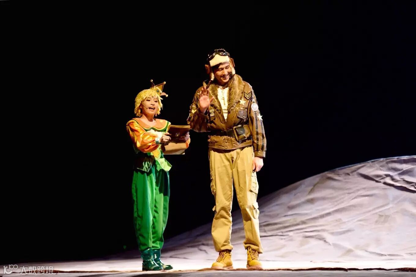一个熟悉的装扮出现在我们面前,他比书中年轻、帅气,和当年我自己臆想的主人公飞行员有点不同,因为剧场空调不制冷的缘故,我对舞台上穿着皮衣,被迫在沙漠遇难降落的“我”开始思想走神——我在想,是什么支撑着他顶着暑热在“沙漠里”气定神闲的开场,等到小王子拿着一号作品出现,我就明白了些什么。