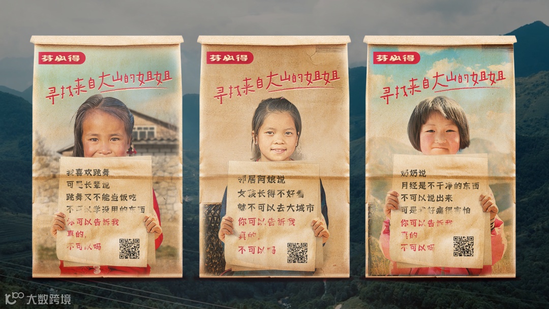 2022年,芬必得上市了对抗经期疼痛的新品。携手有灵且美公益机构,芬必得把品牌新品的包装变成了一封来自大山的寻人启事。