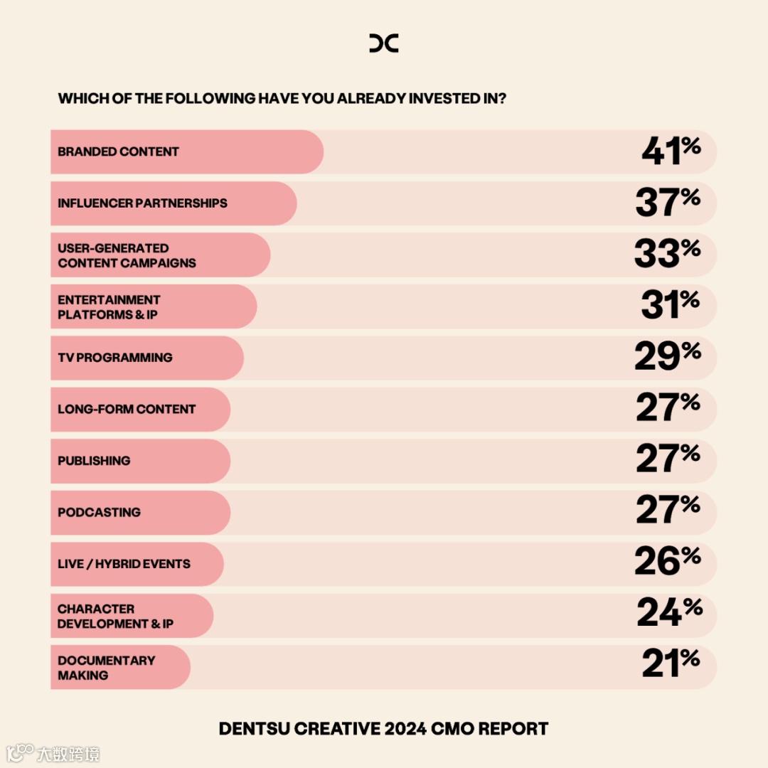Marketers are more committed than ever to building brands through culture. Brands are still built through the tried and tested principles of mental and physical availability, but today mental availability is built through culture and community. Physical availability will be built online as much as offline, through social commerce, D2C platforms and retail media. As an industry, we are living through a global redistribution of attention. As Dr Grace Kite, Economist and Founder, Magic Numbers, puts it: “There’s increasingly little supply of the thing that we advertisers most want to buy – 30 fame driving seconds of a punter watching audio-visual ads on their living room TV screen”. In a world where broadcast media is reaching a long-anticipated tipping point, we need new ways to scale, new ways to tell our brand stories, new ways to build an outsized cultural footprint. 88% of CMOs agree it is more important than ever for brands to be a part of culture, while 78% agree creating Entertainment properties is important to their marketing strategy. As a result, brands are investing in new forms of entertainment and cultural impact. 31% have invested in Entertainment platforms and IP, 29% in TV programming, and 18% in music production. Marketers in the US are particularly invested in content and entertainment; over indexing on music and character IP, while Brazil and Italy lead the way on user generated content and the UK favors publishing and podcasting. Yet 74% say it is challenging to know how to connect their brand to culture. 73% find it a challenge to tell their brand stories in new ways such as entertainment, experience or action, while 77% agree that building brand in a world where broadcast media is less relevant will be a challenge. Helping brands build reach and impact in a new world demands new tools and insights; not all reach is created equal. Dentsu’s pioneering research into The Attention Economy provides unique insight into Attentive Reach; channels and touchpoints that deliver active attention. Married with cultural insight, and the ability to create culture, not simply campaigns these techniques are vital in helping brands win the outsized share of culture they need to thrive. Influencer partnerships and user generated content are already widely adopted when it comes to creating cultural impact. But TV programming and entertainment platforms are also emerging as areas of interest and investment, perhaps prompted by the open-ness of streaming platforms to brand partnerships and monetizing their IP in new ways. Likewise, podcasting has become a popular way of building brand engagement, trust and authenticity. Data from Spotify shows that 54% of podcast listeners believe podcast ads are more effective than ads they see elsewhere, and 52% trust what is being promoted. The content of this article is sourced from the DENTSU CREATIVE 2024 CMO REPORT. Now in its fifth year, the annual study is conducted to provide insight into the hearts and minds of CMOs globally, to help benchmark their direction against peers, and support them developing their creative, experience and innovation roadmaps. To form the CMO Report, the responses to 45 questions posed to 950 CMOs in Australia, Brazil, China, Canada, Germany, Italy, India, Japan, Mexico, Saudi Arabia, Spain, the UAE, US and UK. Eight key themes have been identified to offer an indispensable industry toolkit and roadmap, this year calling for agencies to not only respond to briefs but also to challenge them and drive transformative change. TO READ THE 2024 CMO REPORT IN FULL, PLEASE DOWNLOAD FROM THE DENTSU CREATIVE GLOBAL WEBSITE. www.dentsucreative.com/news/dentsu-creative-cmo-survey-2024 -ENDS- TAP TO READ MOREDentsu Creative 2024 CMO Report From Omnichannel to Omnipresent Creativity | CMO REPORT Unlocking Gen Z 2024 China Focus: A Multi-Dimensional Generation 2024 Unlocking Multifaceted Wellness: China Focus Dentsu Creative Trends Report 2024: The Futures Less Traveled DENTSU CREATIVE 2023 CMO Report: Creativity at a CrosswordsDENTSU CREATIVE 2023 Trends Report: A Tale of New Cities Introducing Dentsu's 5-Power in Creating Health & Wellness dentsu Z decodes luxury brands’ crossovers with Campaign Asia Pets, Tech, Eco-product, Subculture: Latest Gen Z Updates dentsu Z Looks into the World of a Generation of Contradictions
