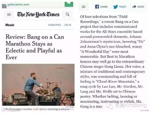美国最具影响力的权威媒体《纽约时报》对龚琳娜在Bang on A Can Marathon音乐会上的表演给予了极高的评价。