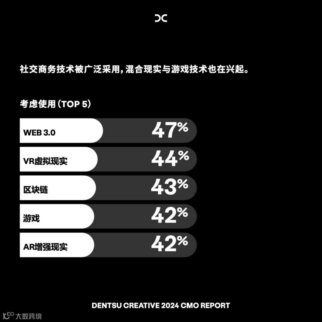 首席营销官们未来最有可能采用的技术包括元宇宙/Web 3.0技术、MR(混合现实)和游戏。在所有这些技术领域,寻求适当的合作伙伴是当务之急。