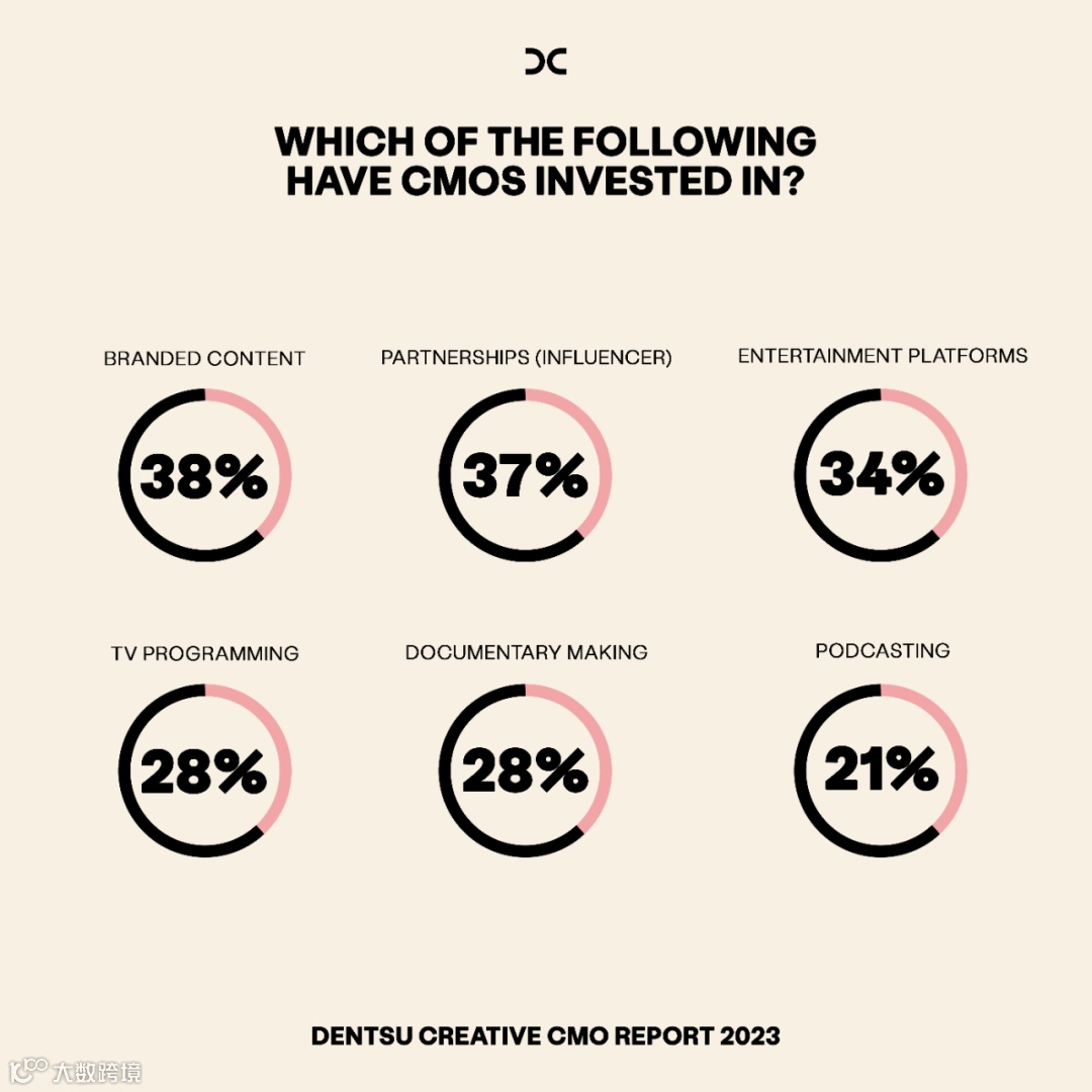 When we asked where CMOs are investing their money today, 38% say they have already invested in ‘branded content’ as an entertainment marketing tactic. 37% have invested in TV Programming, 34% in Influencer partnerships, 33% in Publishing, and 32% in Entertainment Platforms, and IP.
