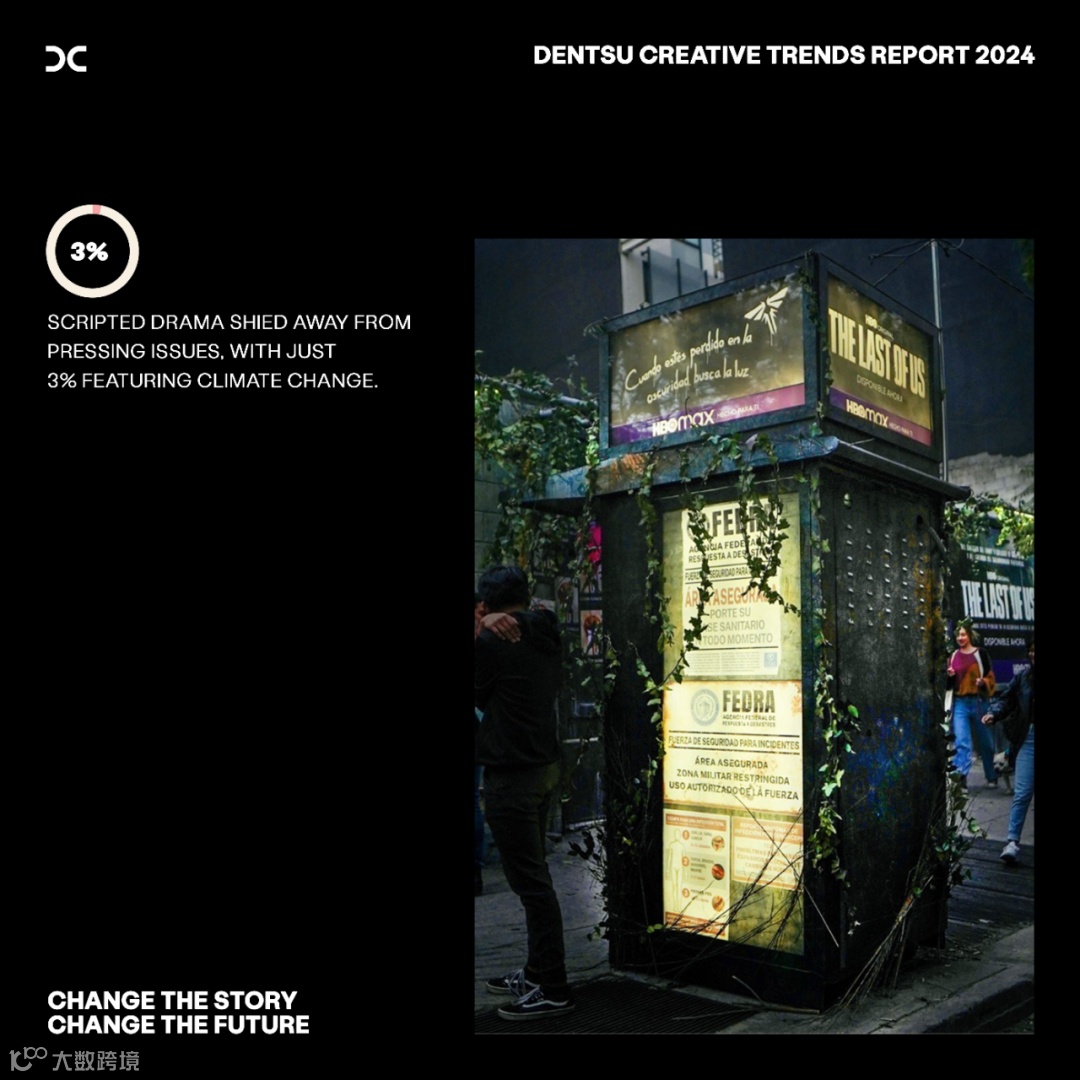 Related to our first trend, we see a reclaiming of genres and formats easily underestimated as superficial, soft, or playful as tools for change. As the creator economy soars and brands embrace entertainment, we see surprising new content formats emerge as drivers of serious business growth, and societal change. A generation raised on world-building and co-creation is taking those skills into adulthood, with heightened expectations of agency and empowerment. Storytelling becomes a force for change, with the long-neglected topic of climate change emerging front and center. In TikTok, we see the honing of perfectly packaged content primed to educate, challenge, or disrupt on any subject, from finance to skincare to social justice. FROM WORLD-BUILDING TO BUILDING BETTER WORLDS A generation raised on the art and craft of world-building expect to take an active role in reshaping the physical world they live in. As part of Fortnite’s “Creative Mode”, Epic Games introduced Unreal Editor inviting players to become engineer-architect-artist-storytellers designing their own “islands”. Nike was one of the first brands to adopt the technology creating Airphoria as a means of immersing fans in an Air Max-themed universe. Meanwhile, Saba looked to Roblox to create the world’s first menstruation education game in the multiverse, successfully educating over 30 million kids online. We see major political organizations legitimize gaming as a space to debate and make a change. The World Economic Forum has created a virtual Swiss town, designed as a place for Davos’ stakeholders to interact and collaborate. The Metaverse Architecture Biennale brought together architects to debate and discuss the potential of architecture and design in the Metaverse. Beyond the virtual world, we see a Minecraft-inspired mentality infiltrate the every day. The CHI 311 site enables Chicago citizens to request tree planting, graffiti removal, and other acts of civic good. Users can track their requests and see the impact they are making in the real world. Guerrilla gardening or “Botanarchy” as author Ellen Miles calls it, continues to engage as a gentler approach to rebellion, with an edge. Miles campaigns for access to green nature to be included in the Universal Declaration of Human Rights and champions guerrilla gardening as providing a vital sense of control and agency in a world where the future can seem volatile. CHANGE THE STORY, CHANGE THE FUTURE “It is impossible to build a better world if one cannot first imagine it”. Lesley Lokko, Novelist and Curator. Since the days when we huddled together around the campfire, we have known the power of storytelling to change behavior. Until recently, however, storytellers have shied away from some of the most pressing issues, with just 3% of scripted drama featuring climate change in any way. In a shift in the cultural landscape, 2023 was the year of the ‘eco-thriller’ with blockbusters like “The Last of Us” and Apple TV’s “Extrapolations” confronting our darkest fears. HBO brought the universe of “The Last of Us” to life to great visceral effect with their ‘Infected Billboard’ in partnership with Dentsu Creative Mexico. The hyper-real fungus appeared to take over everything around it, infecting even a car and street furniture, also going viral online! With their “Mother Nature” film Apple demonstrated conclusively that purpose and entertainment are by no means mutually exclusive, as a concerned Octavia Spencer demanded a status update from execs on their progress on sustainability. Studies demonstrate storytelling significantly outperforms fact-based communication in driving sustainable behaviors. A good place to begin a new narrative is with new storytellers, building on a powerful desire to challenge older, colonial narratives and tell new stories, from new perspectives. In partnership with Dentsu Creative India and Dentsu Creative Portugal, Vedantu, an e-learning platform created “The Everything Book” an innovation that shares the stories of local role models inside an internet signal aggregator to democratize education and inspire children from rural communities in India. THE MEME-ING OF LIFE Like parables or cartoons before them, memes and reels have emerged as a way of distilling complex ideas into bite-sized, shareable, and endlessly repeatable formats. As TikTok demonstrates there is no topic, from finance to Excel hacks to social justice, too complex to be condensed into pithy video content. So it’s no surprise that brands are experimenting with new ways to use them. EcoTok is one such collective of 21 environmental educators and activists seeking to galvanize action through hopeful, short-form storytelling. Understanding the influence of the platform, TikTok launched the #aGoodCollective campaign marking World Mental Health Day with resources and stories to drive mental health awareness. In France, Amazon Prime Video invited consumers to compete for a voice-acting role in one of its upcoming Amazon Original shows, using TikTok’s Duet feature. The campaign earned 120,000 new followers on Prime Video France’s TikTok account. To mark ‘World Day of Theatre’ Dentsu Creative Kenya invited the H-Town Kids, famous for their scrappy online parodies, to re-enact popular Netflix shows. WHAT IT MEANS FOR BRANDS & BUSINESSES... GAMING IS SERIOUS BUSINESS If we want to change attitudes and behavior, it may start with play. If we can convince a generation to take the same sense of agency and ownership they feel in games into the real world imagine the impact they can have on the world. MAIN CHARACTER ENERGY MATTERS If we want to tell new stories, we need new heroes, and it matters who is holding the pen. It’s time for brands to lead the way in elevating new voices, with new and diverse perspectives. NEXT GENERATION CREATORS The creator economy has already had an extraordinary impact on the world of marketing. Now imagine 