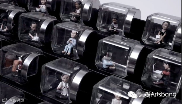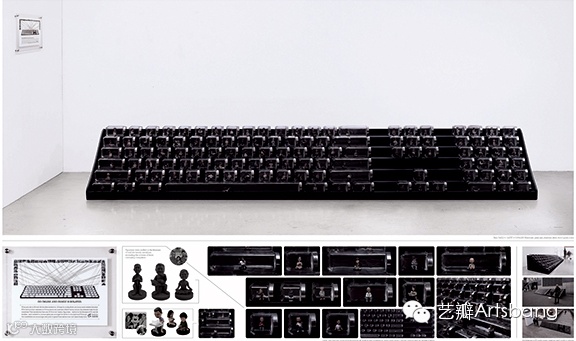 《隔离的键盘》创意依据真实的家庭形象,塑造了116个形态各异、惟妙惟肖的10厘米高的人物塑像,重现每个人过度使用电脑的情景,并将这些人物放置到玻璃瓶中,装置在一个长4.65米,宽1米,高0.58米的黑色底座上,排布成巨大的键盘,如同一个个真实的家庭被隔离在按键之中。