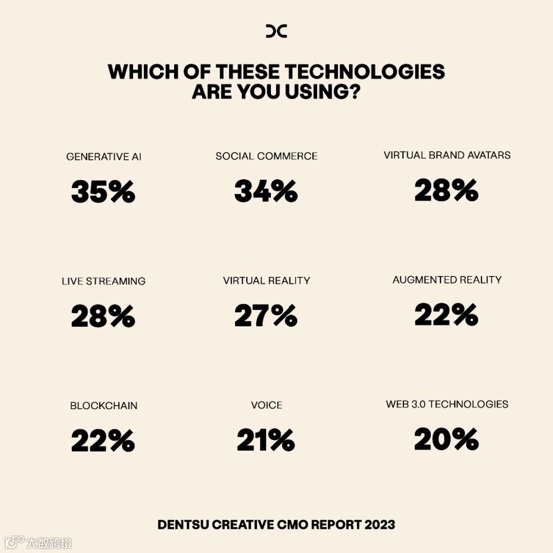 The most commonly used technologies CMOs claim to be leveraging today include social commerce (35%), chatbots for CX (28%), virtual brand properties like avatars and idols (28%), and virtual reality (27%).