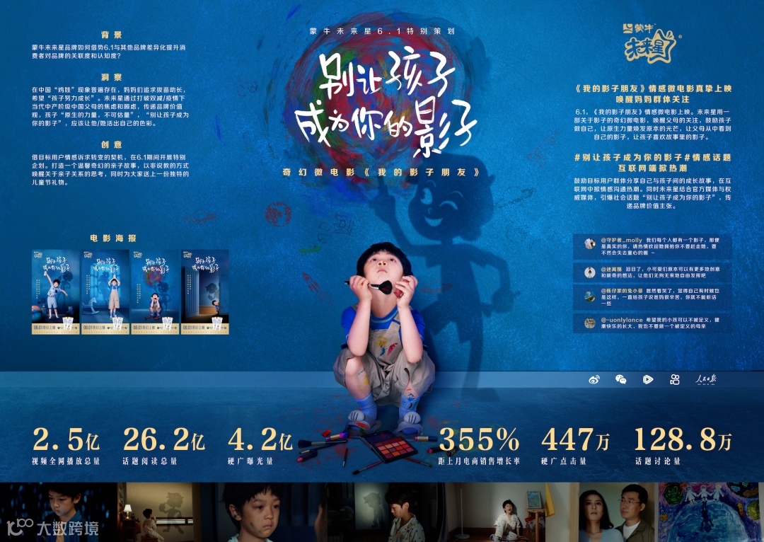 洞悉这一教育痛点,蒙牛未来星于儿童节之际打造了一支情感微电影《我的影子朋友》,探讨“影子式育儿”下的亲子关系,唤起家长们的思考。