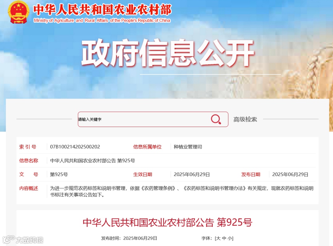 7月31日,农业农村部发布第925号公告,就农药标签和说明书标内容作出进一步规范。公告全文如下: