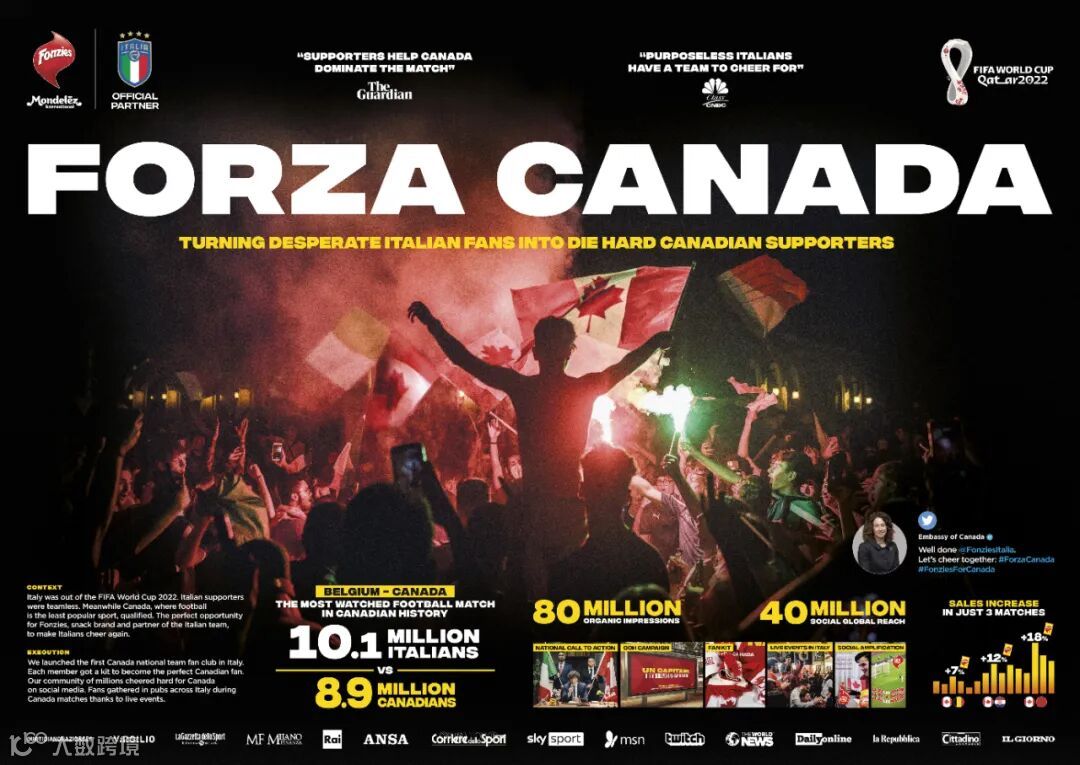 During the last World Cup, DENTSU CREATIVE Milan team helped Fonzies, snack brand and partner of the Italian football team, turned desperate Italian fans into die hard Canadian supporters through a national call to action named “FORZA CANADA.”