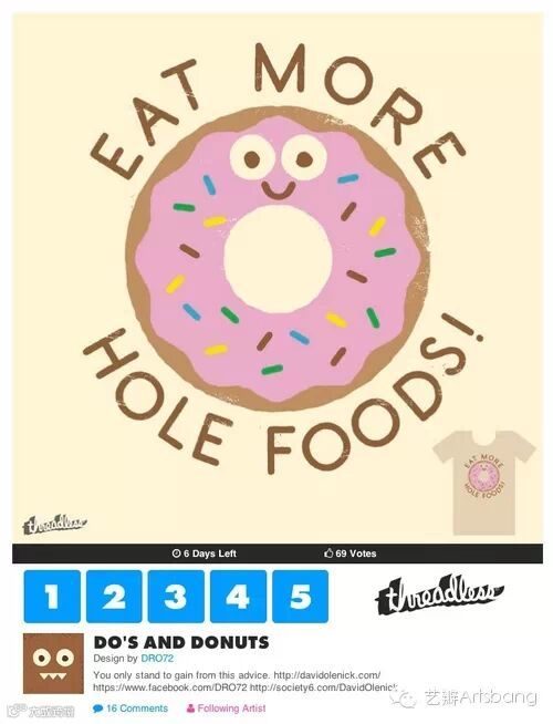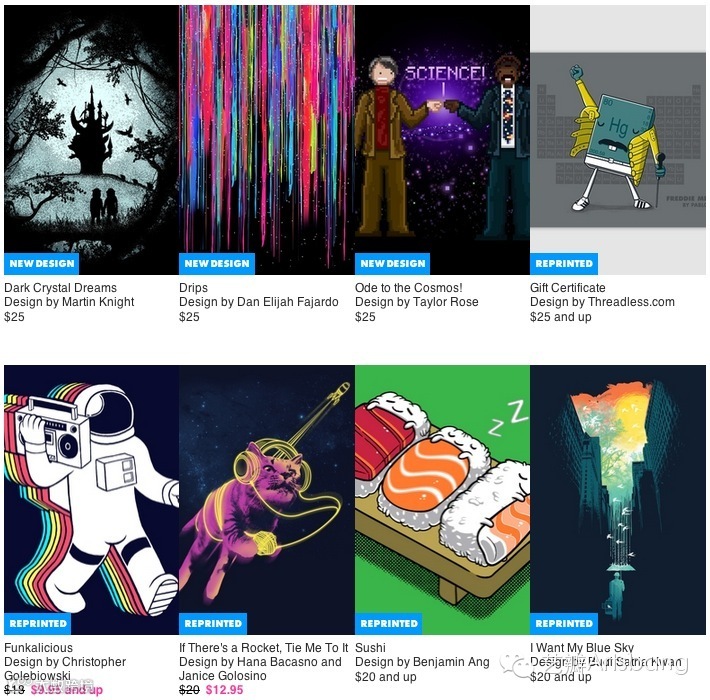在Threadless上,每周都会举办设计竞赛。艺术术家们可以上传自己设计的T恤图案。每个人都能自由上传自己的的作品,讨论自己喜欢的东西。