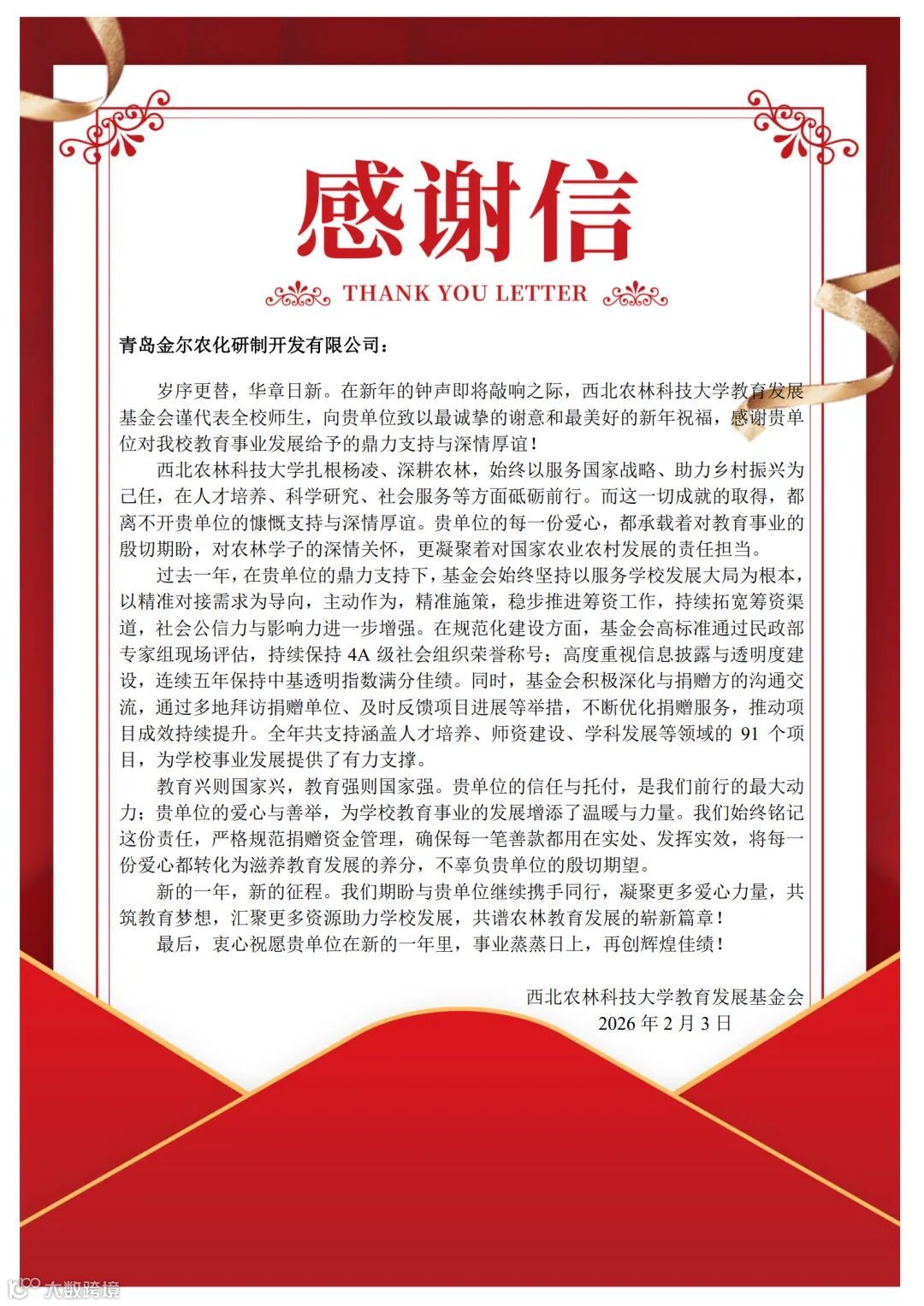 近日,我们收到西北农林科技大学教育发展基金会情意真挚的感谢信。字里行间,满载着对过往合作的珍视与对未来携手的期许。这份来自学术殿堂的认可,令我们倍感温暖,也深感责任之重。