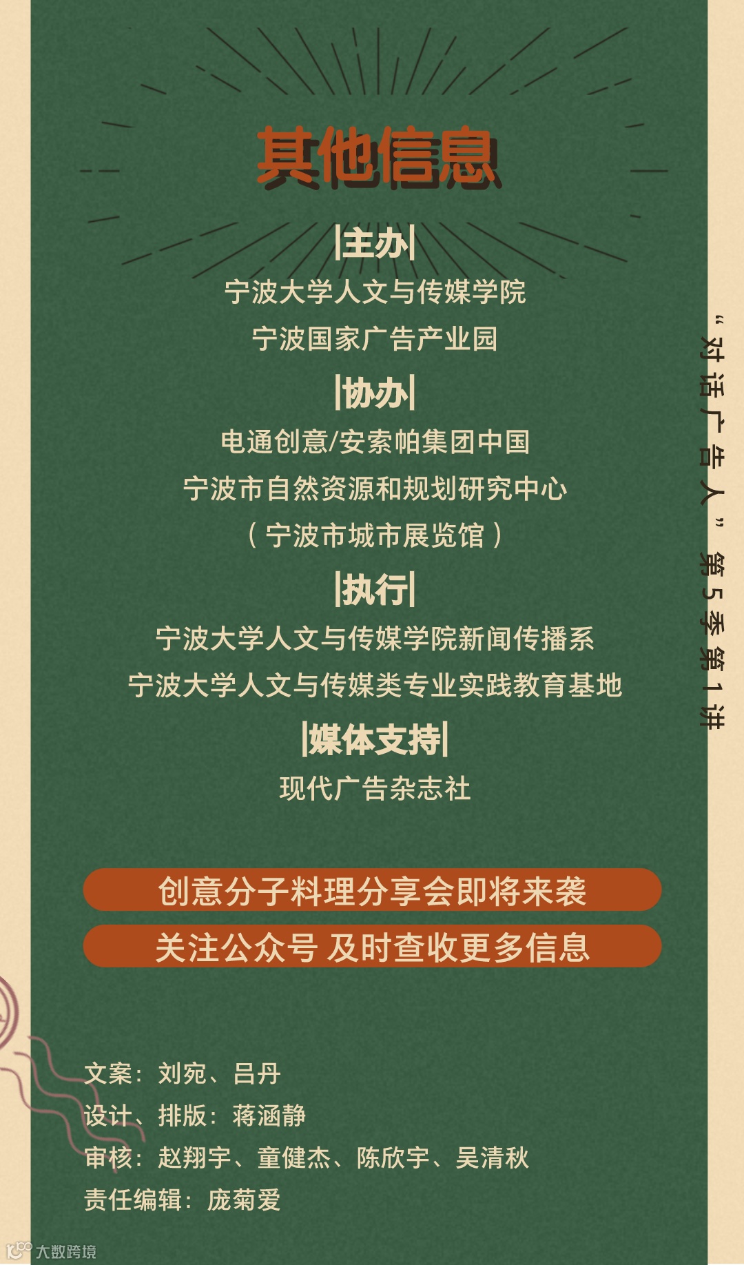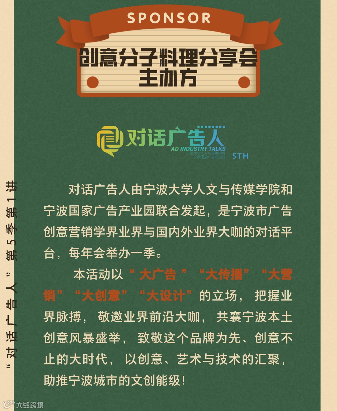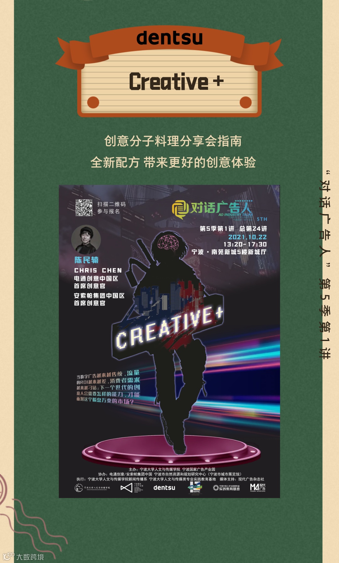 对话广告人由宁波大学人文与传媒学院和宁波国家广告产业园联合发起,是宁波市广告创意营销学界业界与国内外业界大咖的对话平台,每年举办一季。本活动以大广告大传播大营销大创意大设计的立场,把握业界脉搏,敬邀业界前沿大咖,共襄宁波本土创意风暴盛举,致敬这个品牌为先、创意不止的大时代,以创意、艺术与技术的汇聚,助推宁波城市的文创能级!安索帕电通国际的一员,是全球化的创意体验代理商,在51个国家和地区拥有数字精英。安索帕致力于通过策略与创新、产品与体验、品牌设计生态系统、以及传播&内容,为互联未来打造独特的品牌和创新的体验。安索帕集团中国先后获得包括戛纳金狮、LIA伦敦国际奖、金投赏最佳数字创意与数字媒介代理商、艾菲奖大中华区最具实效代理网络金奖等在内超过500项全球、亚太及国内的奖项。曾在2019年戛纳创意节、纽约广告节Spikes Asia、D&AD创意奖等国际权威奖项中担任评委带领团队先后获得包括戛纳金狮、LIA伦敦国际奖、金投赏最佳数字创意代理商、艾菲奖大中华区最具实效代理办公室金奖等在内的超过150项全球、亚太及国内