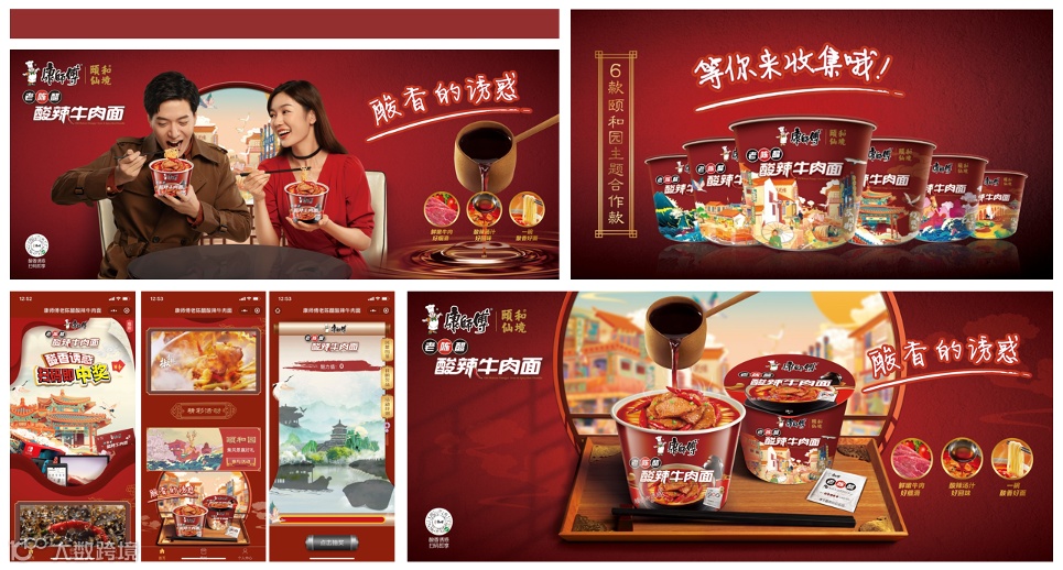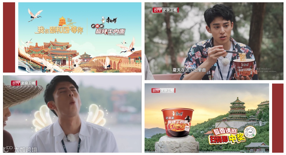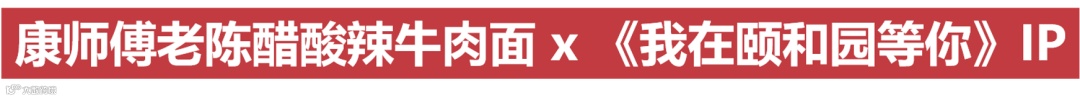 康师傅老陈醋酸辣牛肉面品牌,通过与文化类IP《我在颐和园等你》节目合作,诱发文化价值认同感;并透过嘉宾王鹤棣展现食用场景,促动消费者指名购买,更与外围结合互动H5、颐和园合作款包装,衍生商品,促进品效合一。