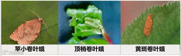 为害特征:①苹小卷叶蛾,幼虫为害果树的芽、叶、花和果,小幼虫常将嫩叶边缘卷曲,大幼虫常将2-3张叶片平贴,将果实啃成许多不规则的小坑洼。②顶梢卷叶蛾,啮食附近幼芽、蕾、花、幼果及如梢,以嫩梢受害最重,新梢生长盛期与成虫盛发期吻合的品种,受害尤重。③黄斑卷叶蛾,幼虫吐丝连结数叶,或将叶片沿主脉间正面纵折取食,藏于其间危害。