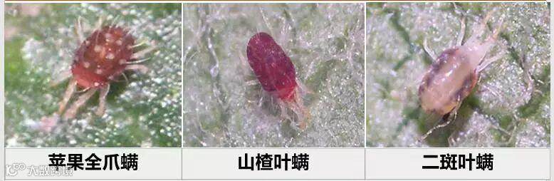为害特征:①山楂叶螨,为害初期叶部症状为局部褪绿斑点,后逐渐扩大成褪绿斑块,严重时整张叶片发黄、干枯,造成大量落叶、落花、落果; ②苹果金爪螨,在叶片背面进行为害,导致叶片失绿,早起脱落,严重影响植株的营养合成,削弱树势; ③二斑叶螨,在叶片背面刺吸汁液,危害初期叶片正面出现若干针眼般枯白小点,后期快速增多,以致整片叶枯白。虫口密度增大后,叶背结白色网,结网速度很快,短期内可造成严重危害,叶片焦枯脱落。