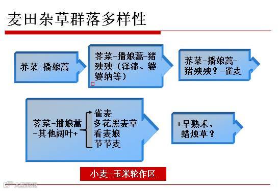 越冬性杂草:播娘蒿、荠菜、猪殃殃、麦瓶草、麦家公、打碗花、刺儿菜、泽漆、繁缕、宝盖草、阿拉伯婆婆纳等。