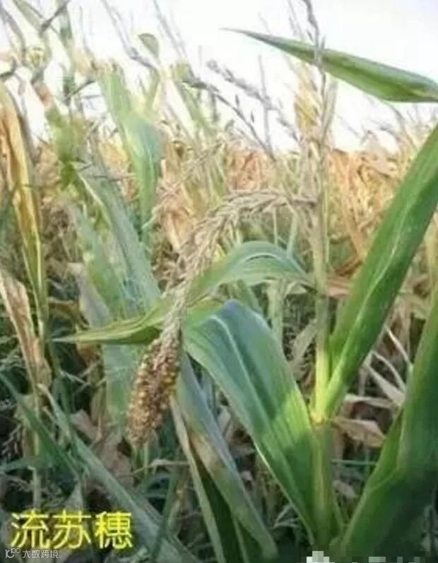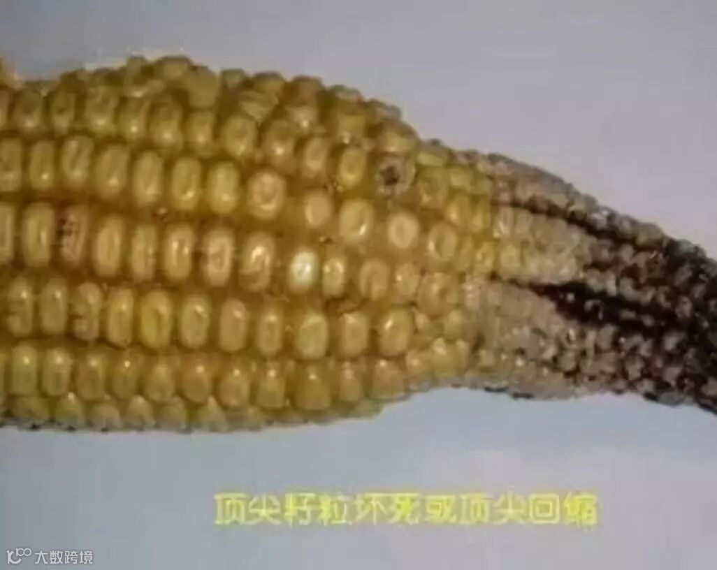 特征:穗基部发育正常,有稀疏的籽粒,但往上至穗顶端部分的发育提早停止,几乎没有籽粒。