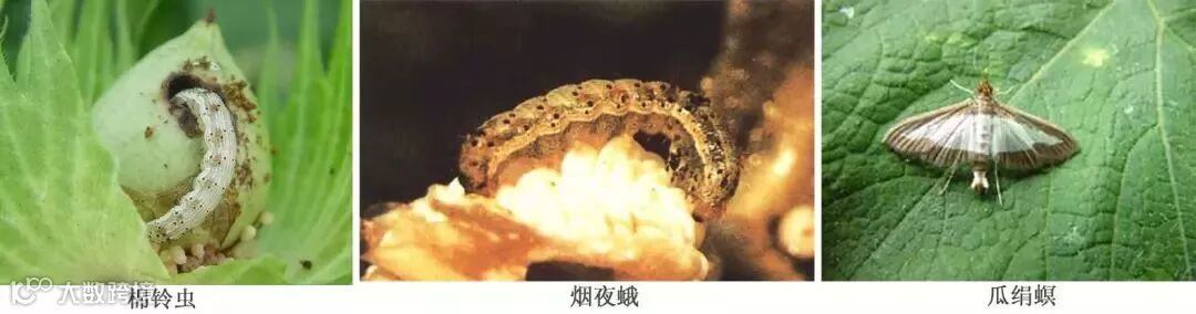 蛀果类[棉铃虫、烟实夜蛾(烟夜蛾、烟青虫、烟草夜蛾)、瓜绢野螟(瓜绢螟)]:为害番茄、辣椒、茄子等蔬菜、南瓜、黄瓜、丝瓜等瓜类。