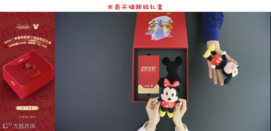 内含物代表了米奇超级品牌日对消费者满满的祝福,米奇玩偶、米奇天猫超级品牌日定制手包、联名日历来代表对消费者的陪伴。另有米奇经典片段胶片书签,每张均印有“专属美好编号”。